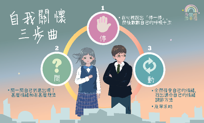 學校可下載以下「多關懷.添幸福」錦囊卡,並由班主任向學生派發小錦囊卡及講解內容,提醒他們要妥善照顧自己情緒上的需要,養成關愛自己的習慣,及積極鼓勵求助的文化。