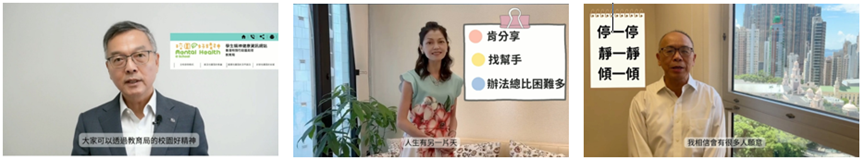 為凝聚各界的力量,教育局製作了三輯短片,為同學和老師打氣。第一輯短片邀請了林正財醫生、葉兆輝教授和林美玲醫生,鼓勵同學以正向思維面對挑戰,並提醒學校人員可以善用不同的資源,創設健康幸福的校園。
