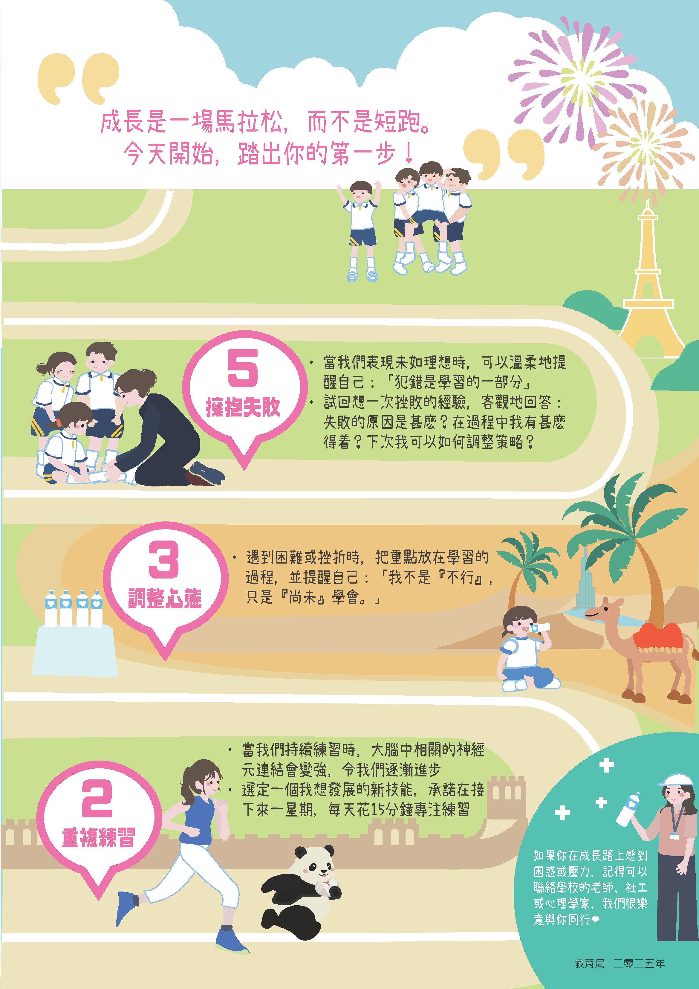 學校可列印以下電子海報及張貼於學校或課室的當眼處或用作教學活動,亦可轉發給學生及家長,向學生傳遞「成長型思維」的核心概念,讓學生參考當中的思考問題及實用建議,提升抗逆力。