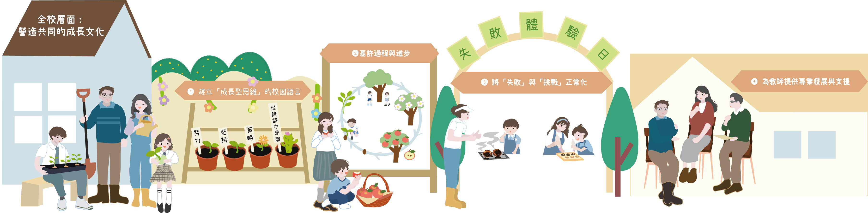 以下錦囊為學校人員提供實用策略,分別從「全校層面」(如建立校園文化、舉辦全校活動)及「課堂層面」(如課堂提問技巧、回饋方式)入手,在校內系統性地推動成長心態。
