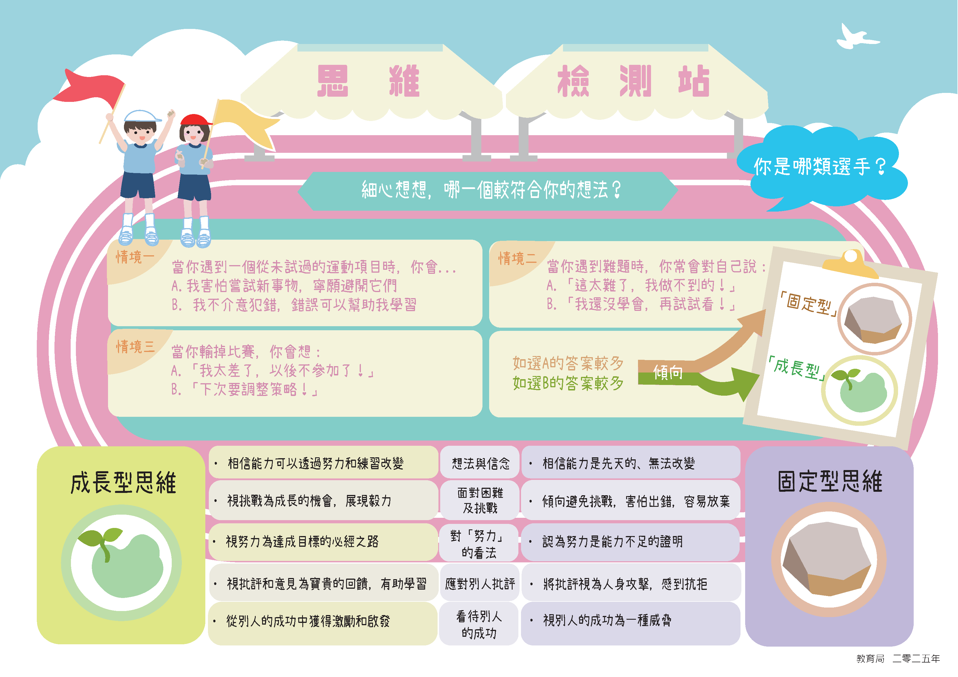 教育局製作了兩段短片,解釋「成長型思維」與「固定型思維」之間的差異。影片透過生活化的場景示範如何在日常互動中培養孩子的成長心態,幫助他們掌握有效的學習策略及調整方法,並在需要時尋求適當的支援。